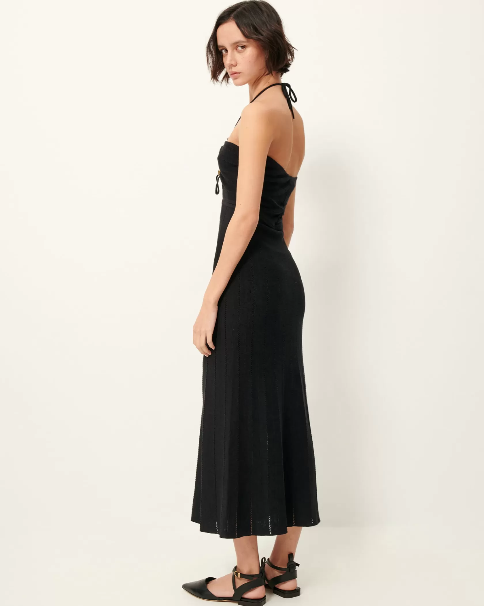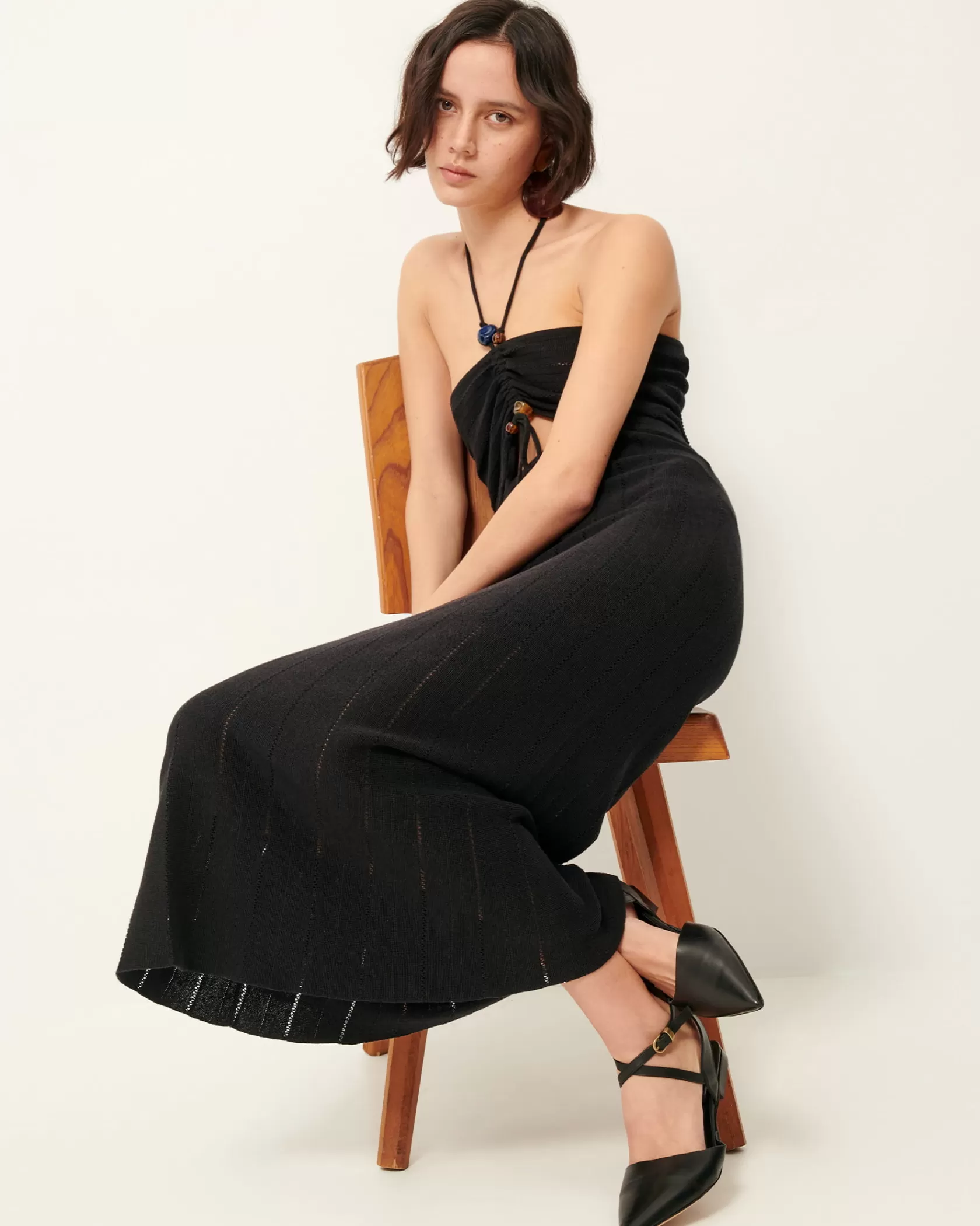 Robe longue à liens ornés de perles bijoux colorées, en maille fine et détails de points ajourés.