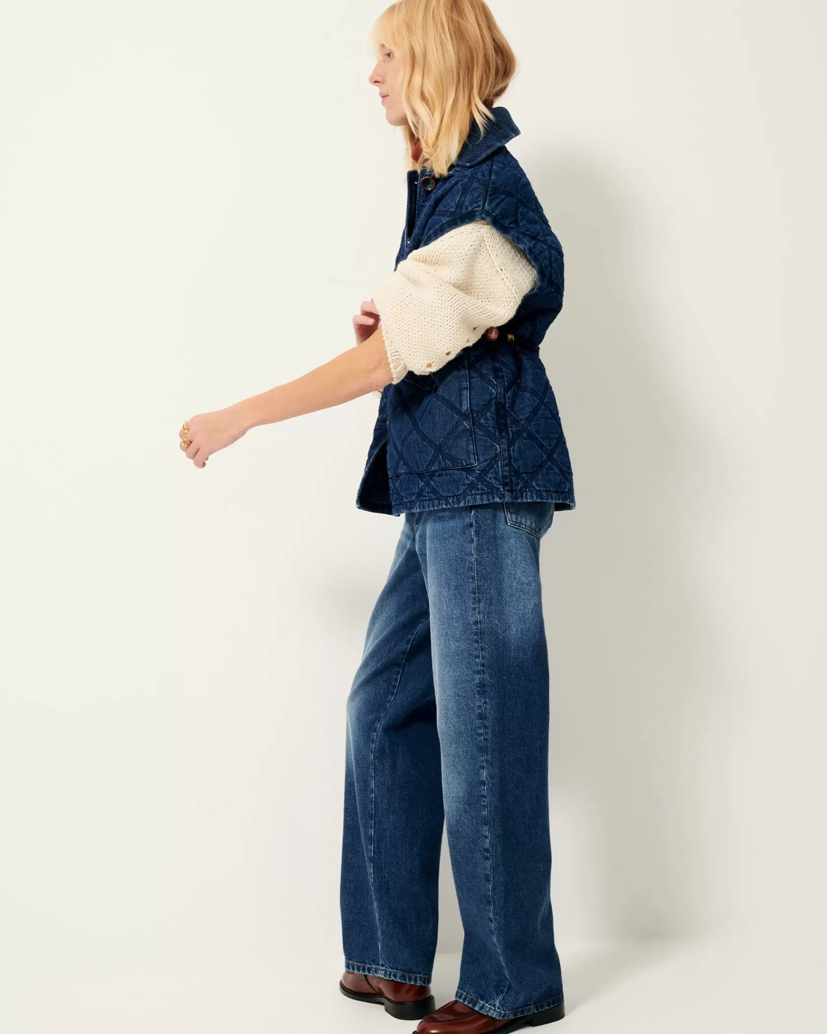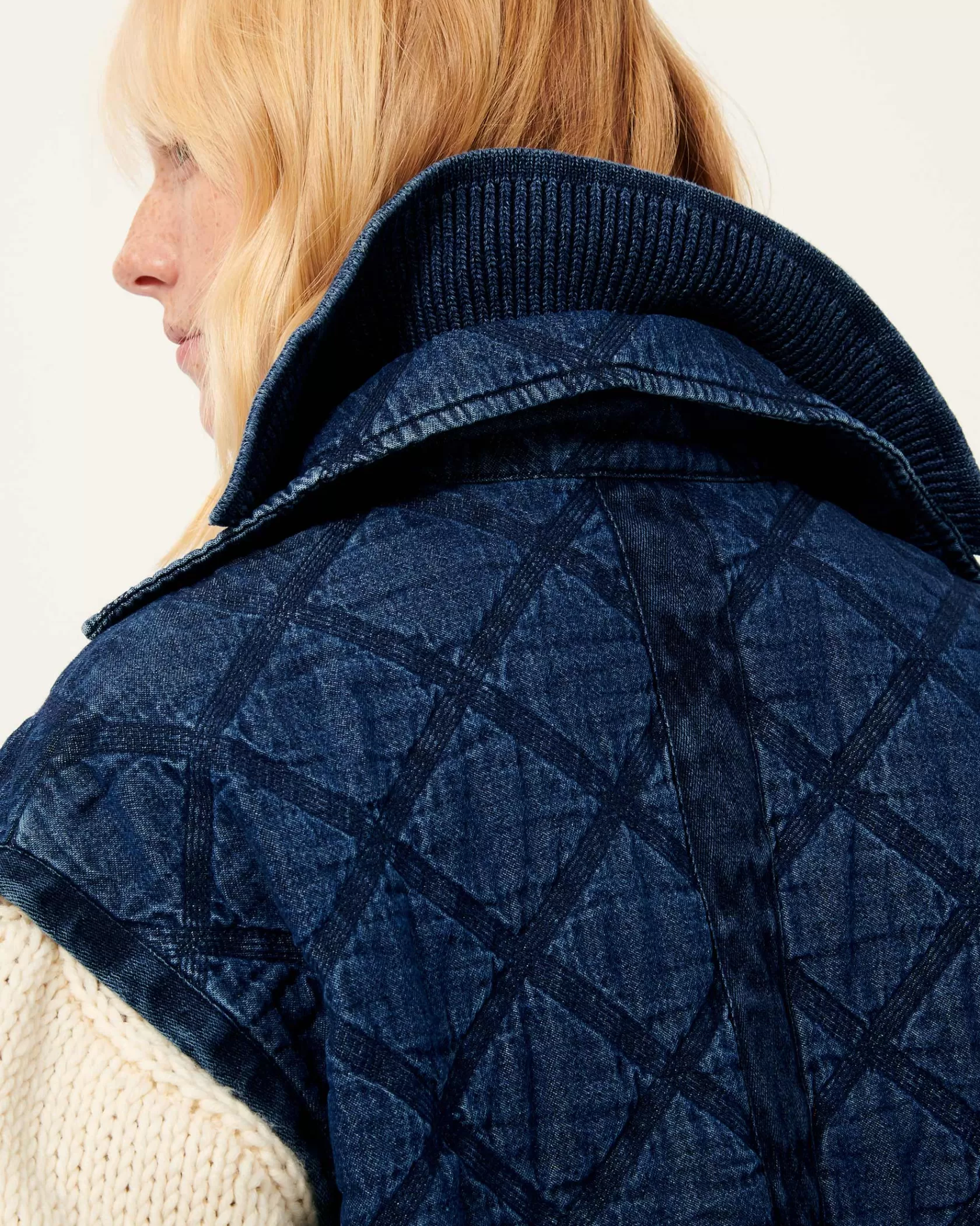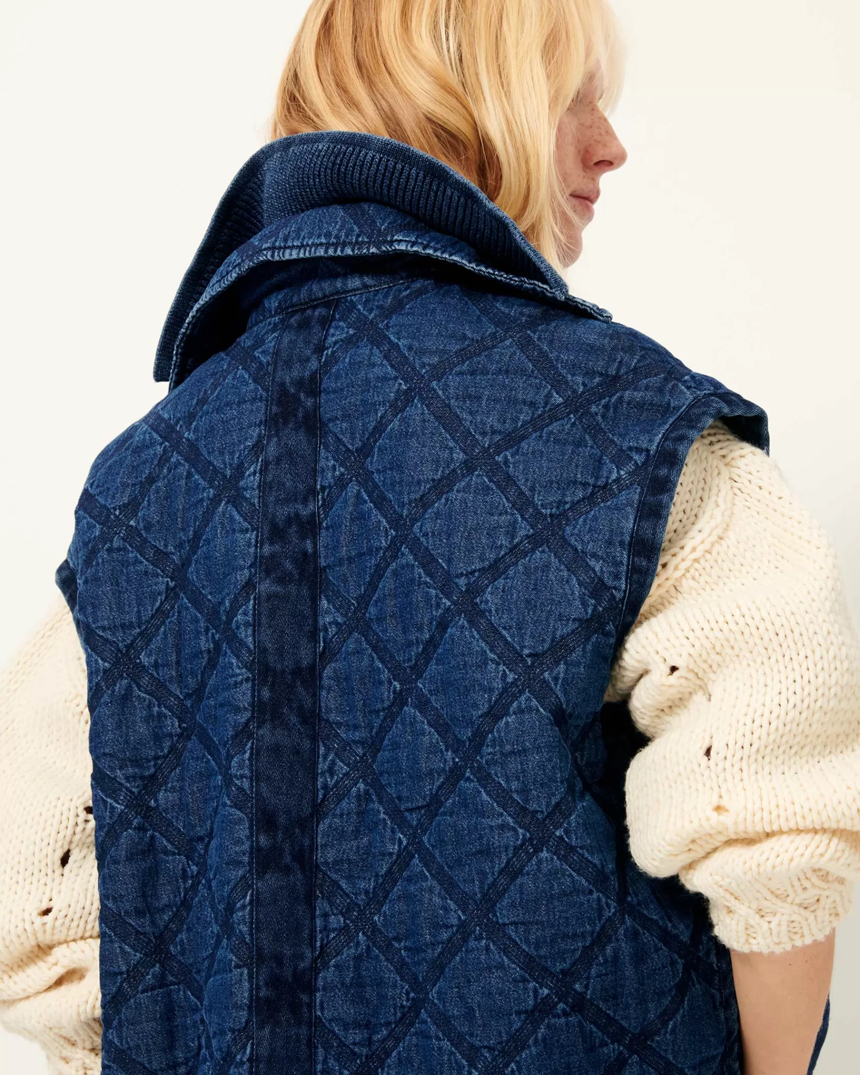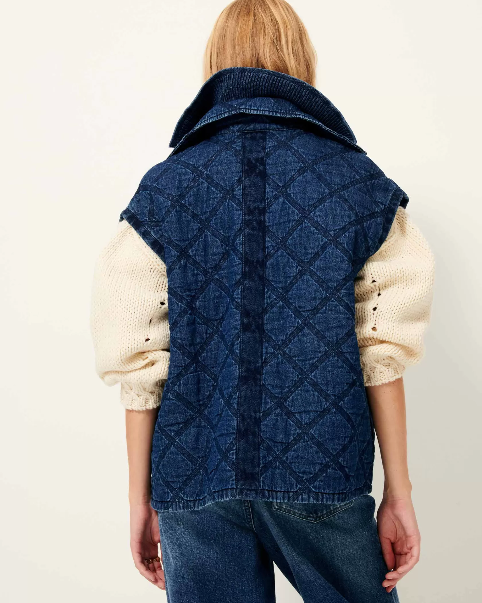 Veste sans manches à col amovible en matelassage stonewashé de toile de denim.