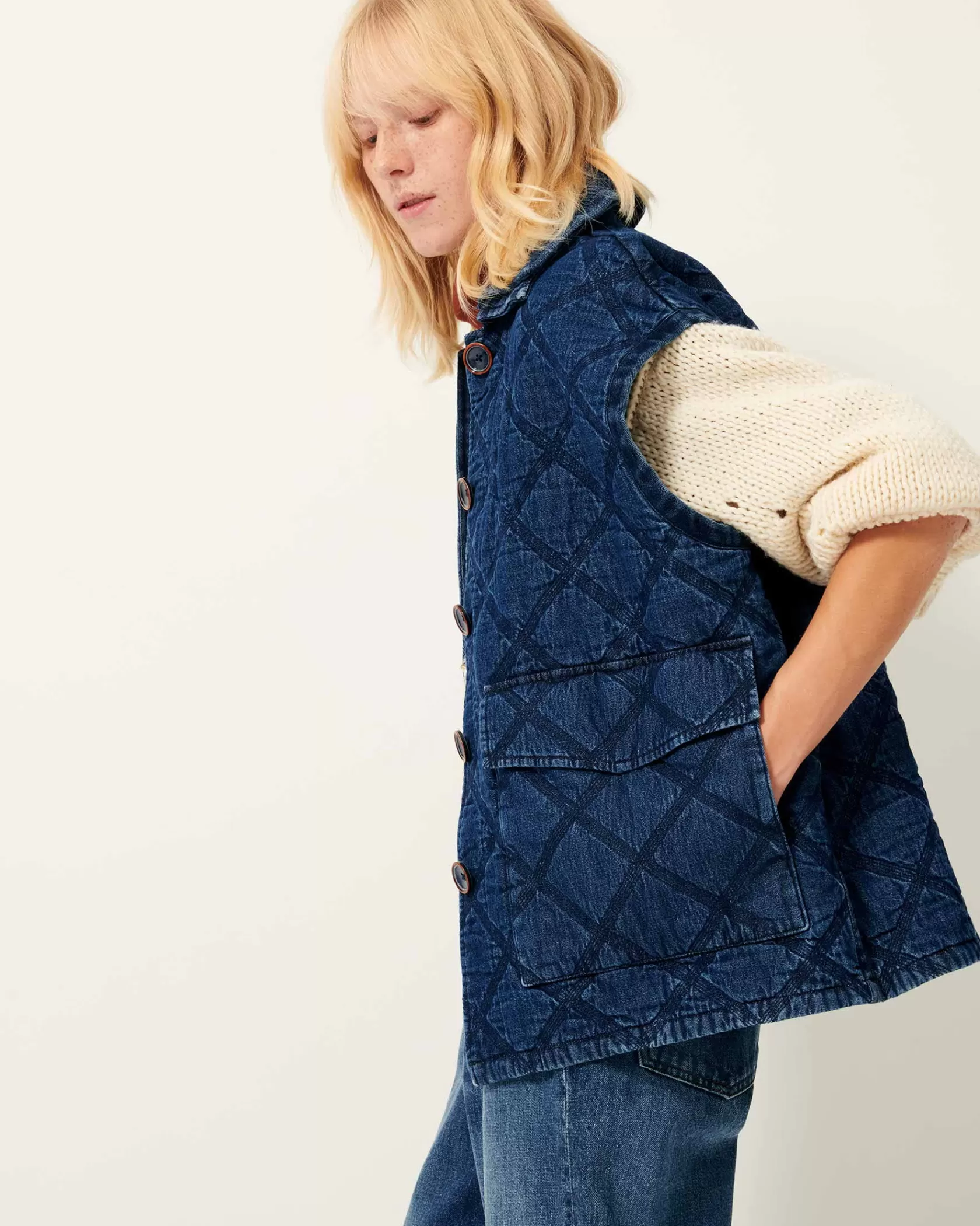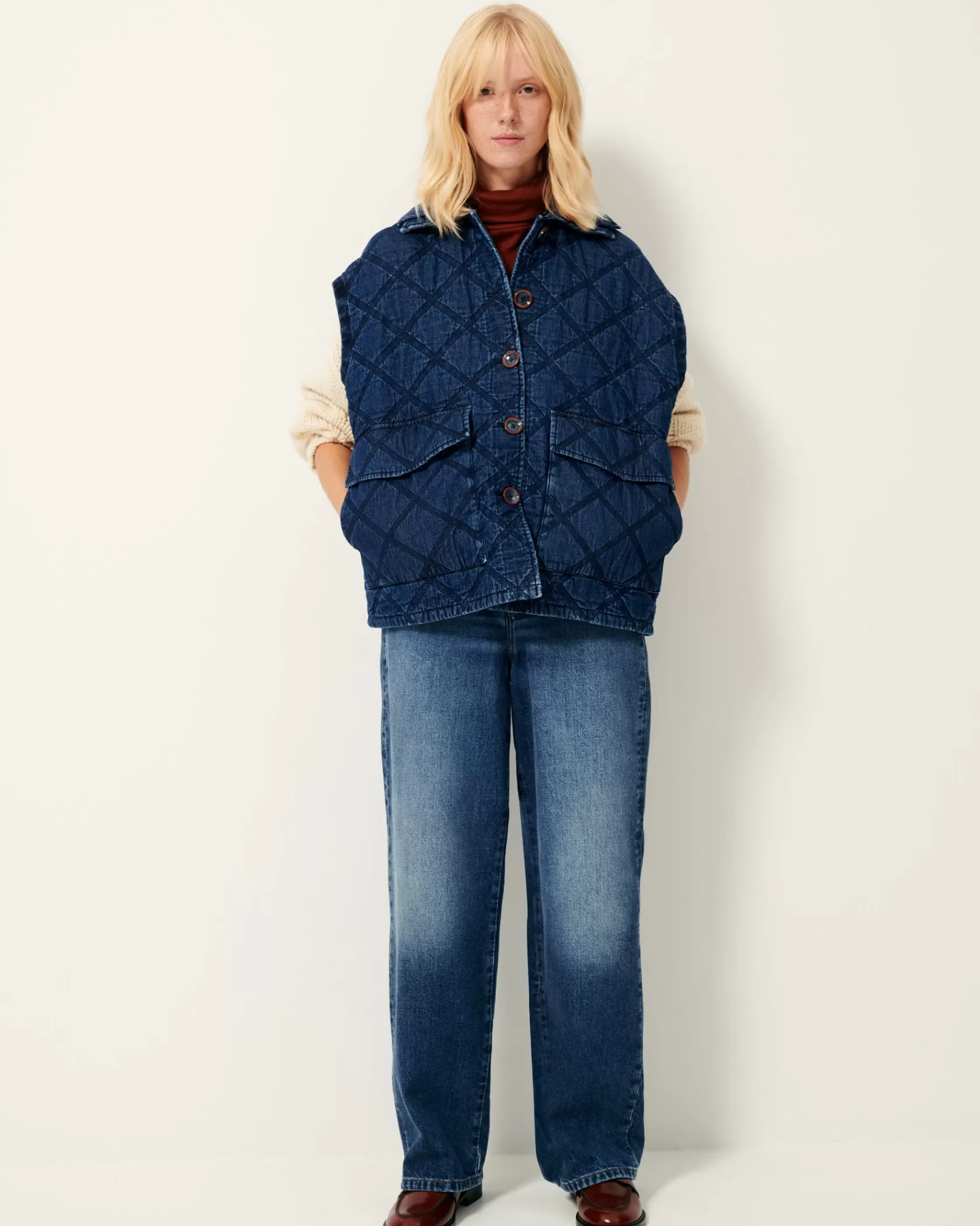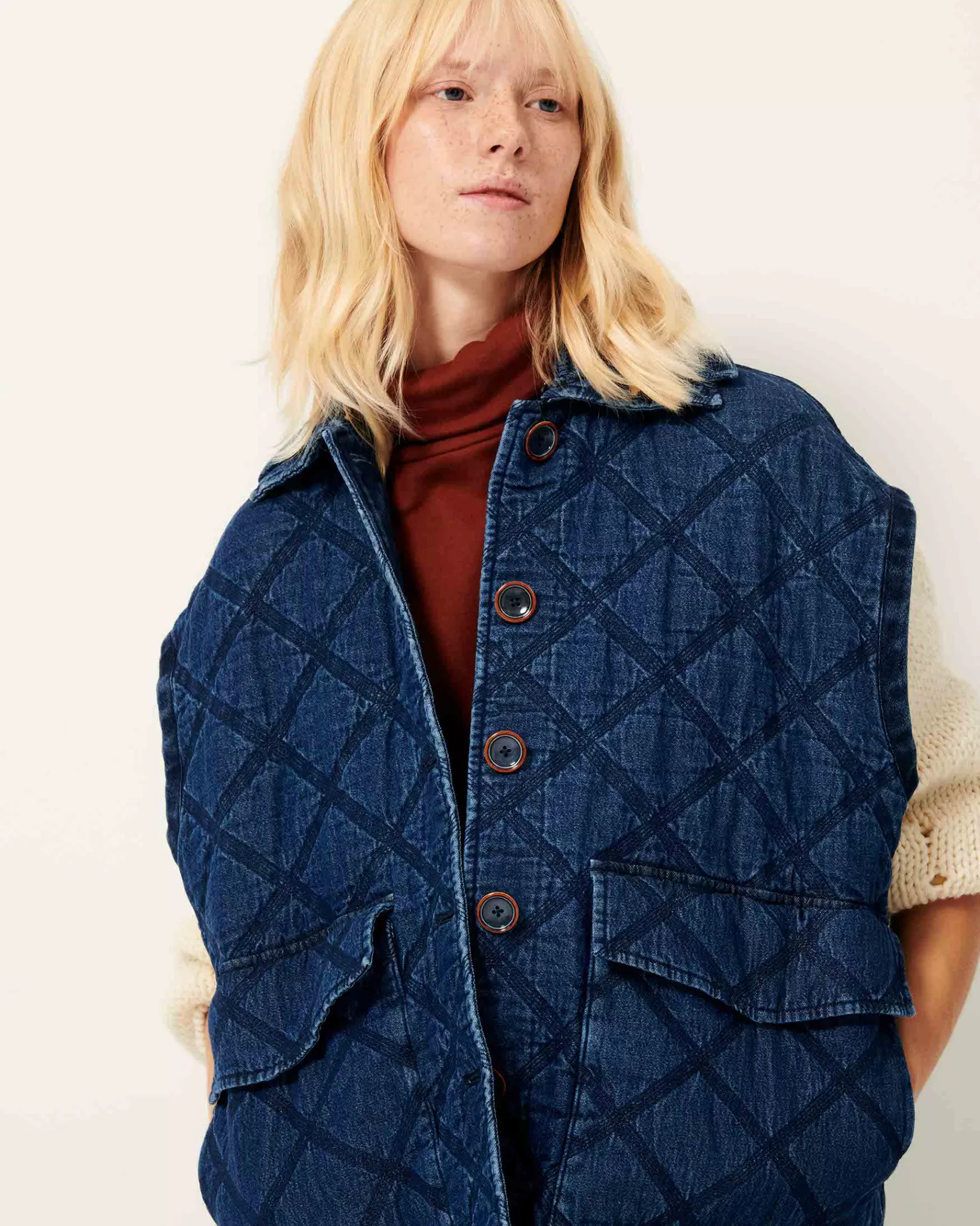Veste sans manches à col amovible en matelassage stonewashé de toile de denim.Col amovible.Fermeture boutonnée devant…