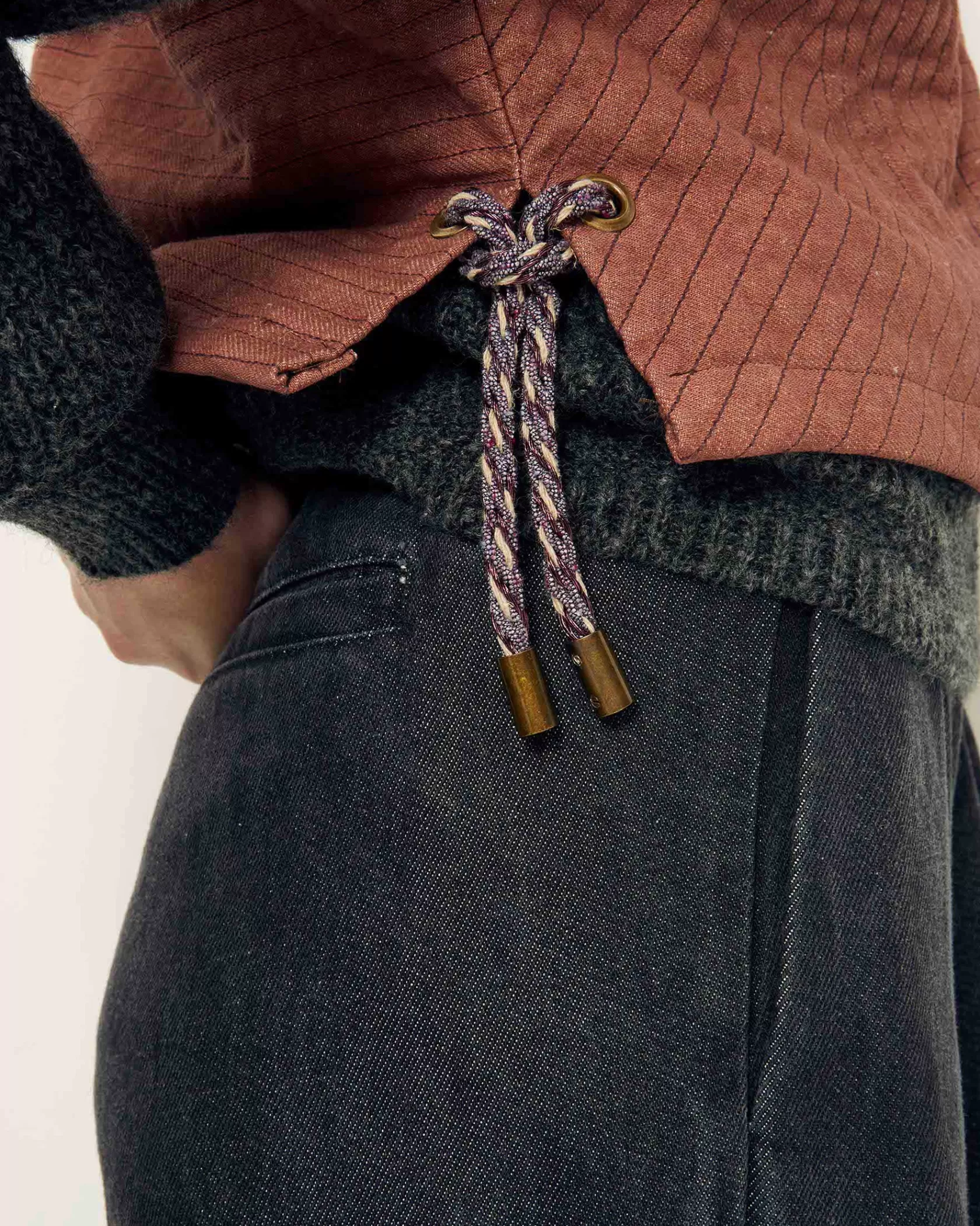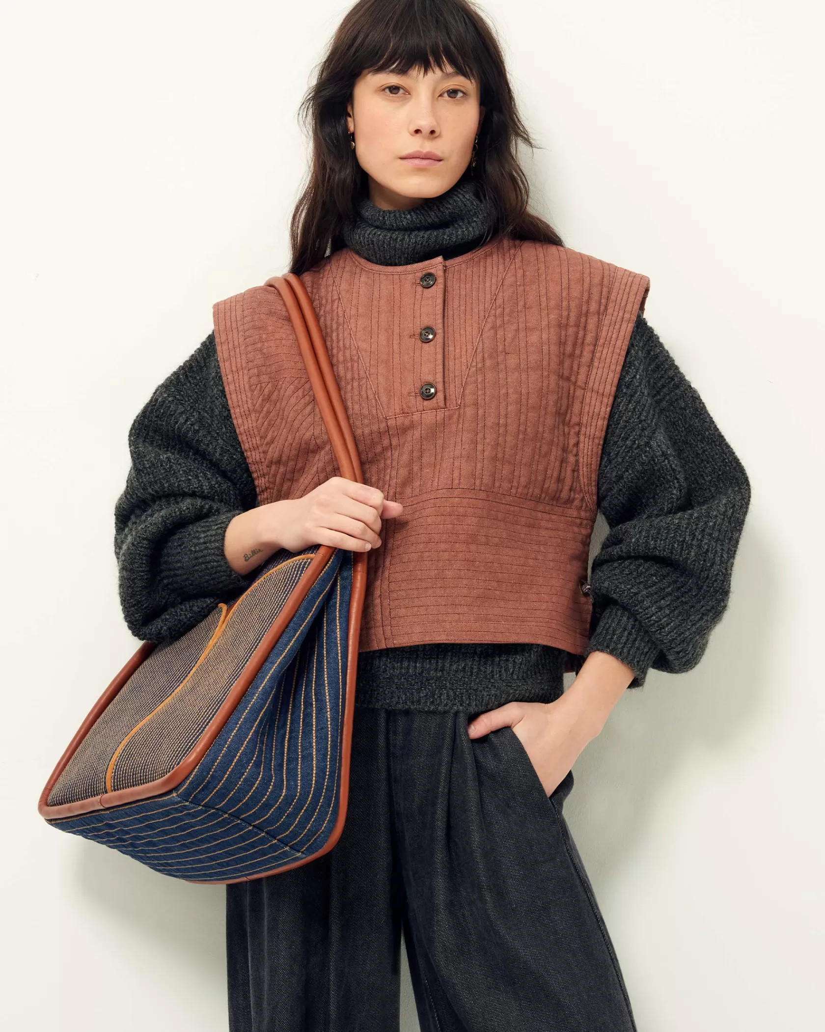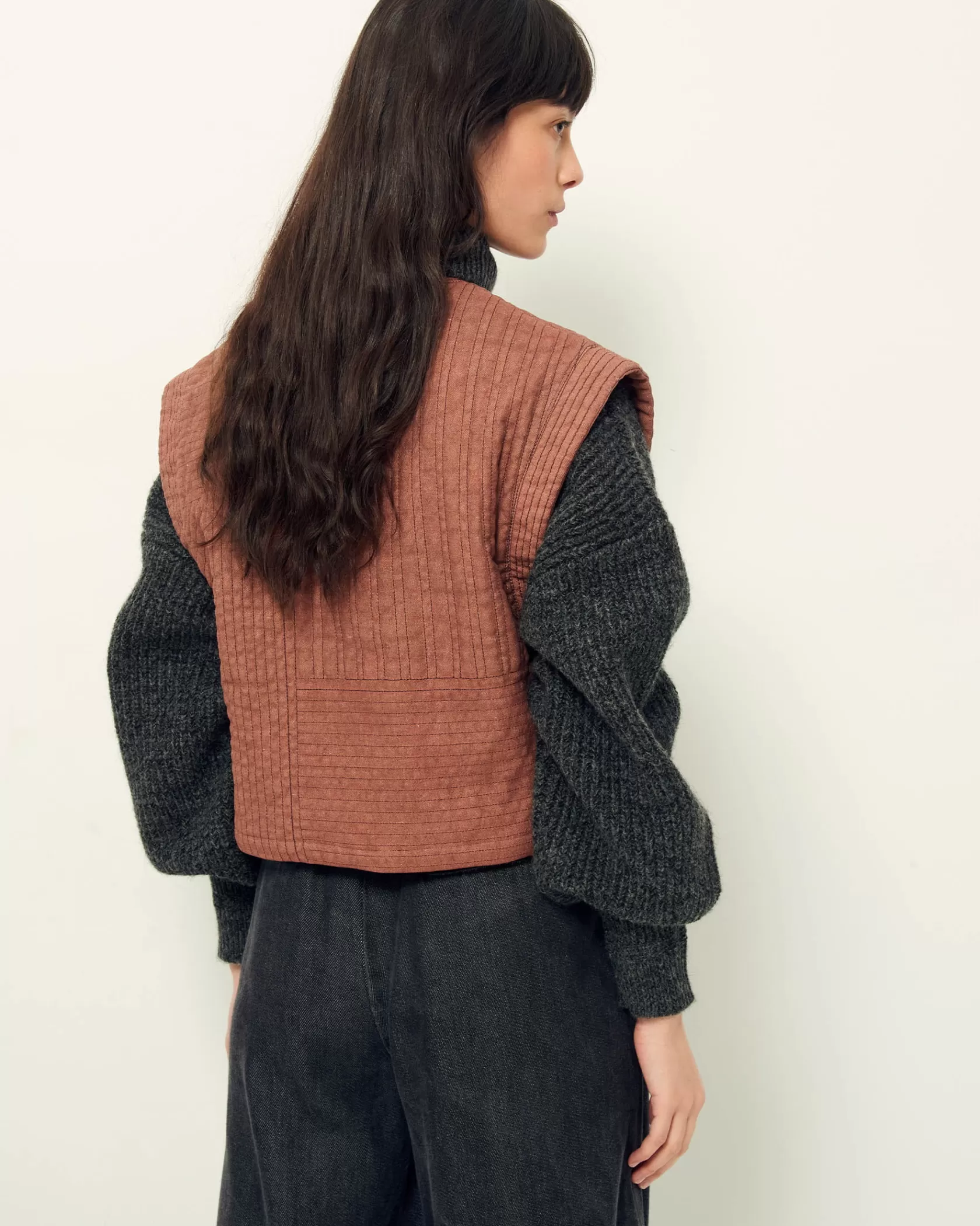 Vareuse sans manches matelassée avec détail de liens sur les côtés en denim stonewashé et surteint, surpiqué fantaisie et matelassé esprit patchwork de boutis, motifs exclusif Sessùn.