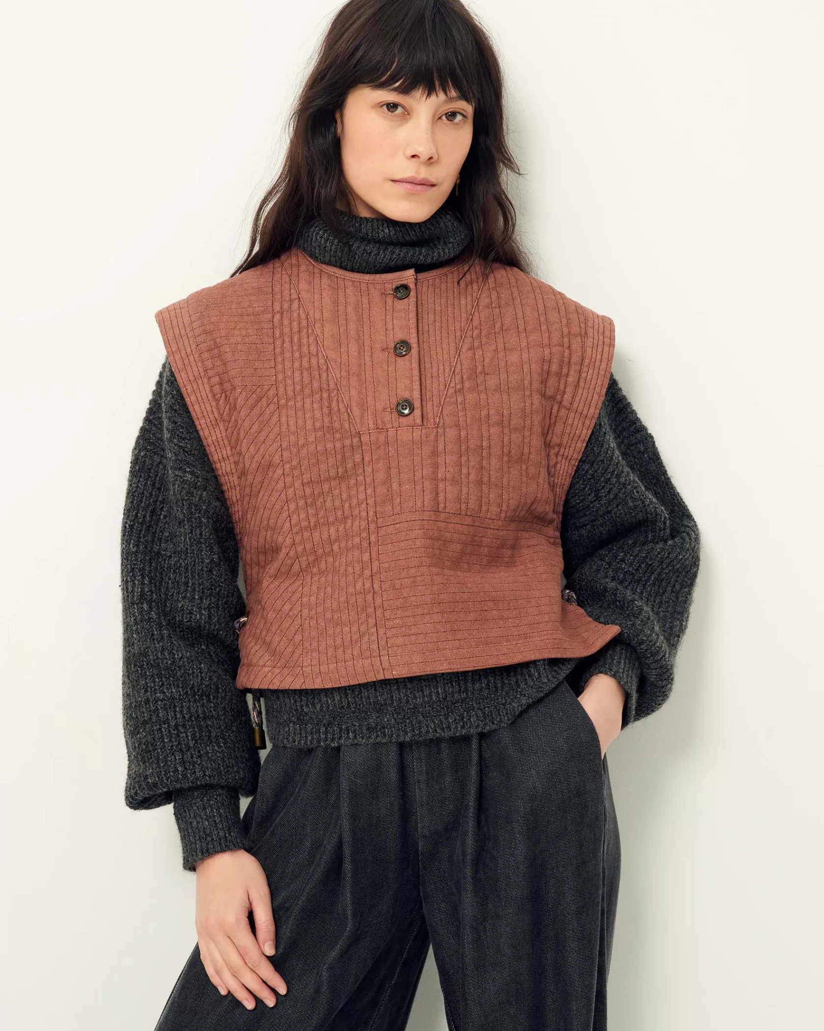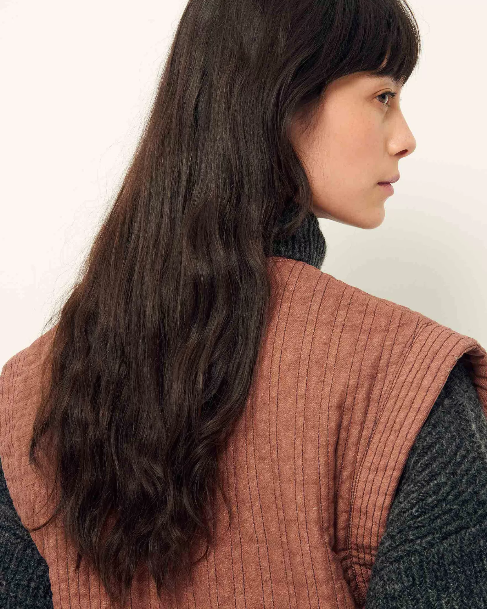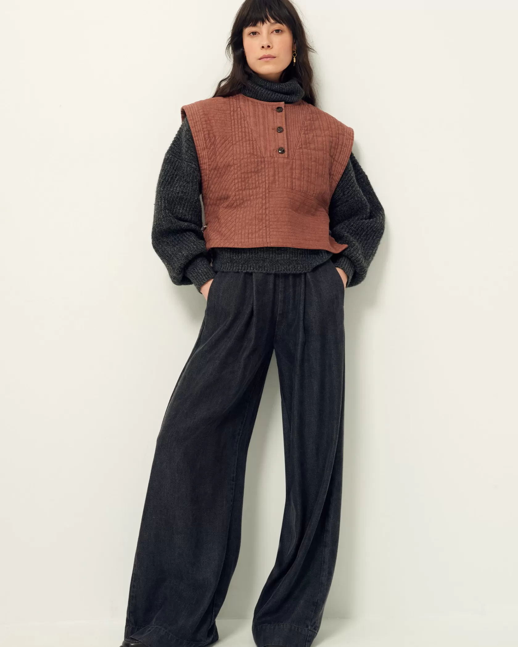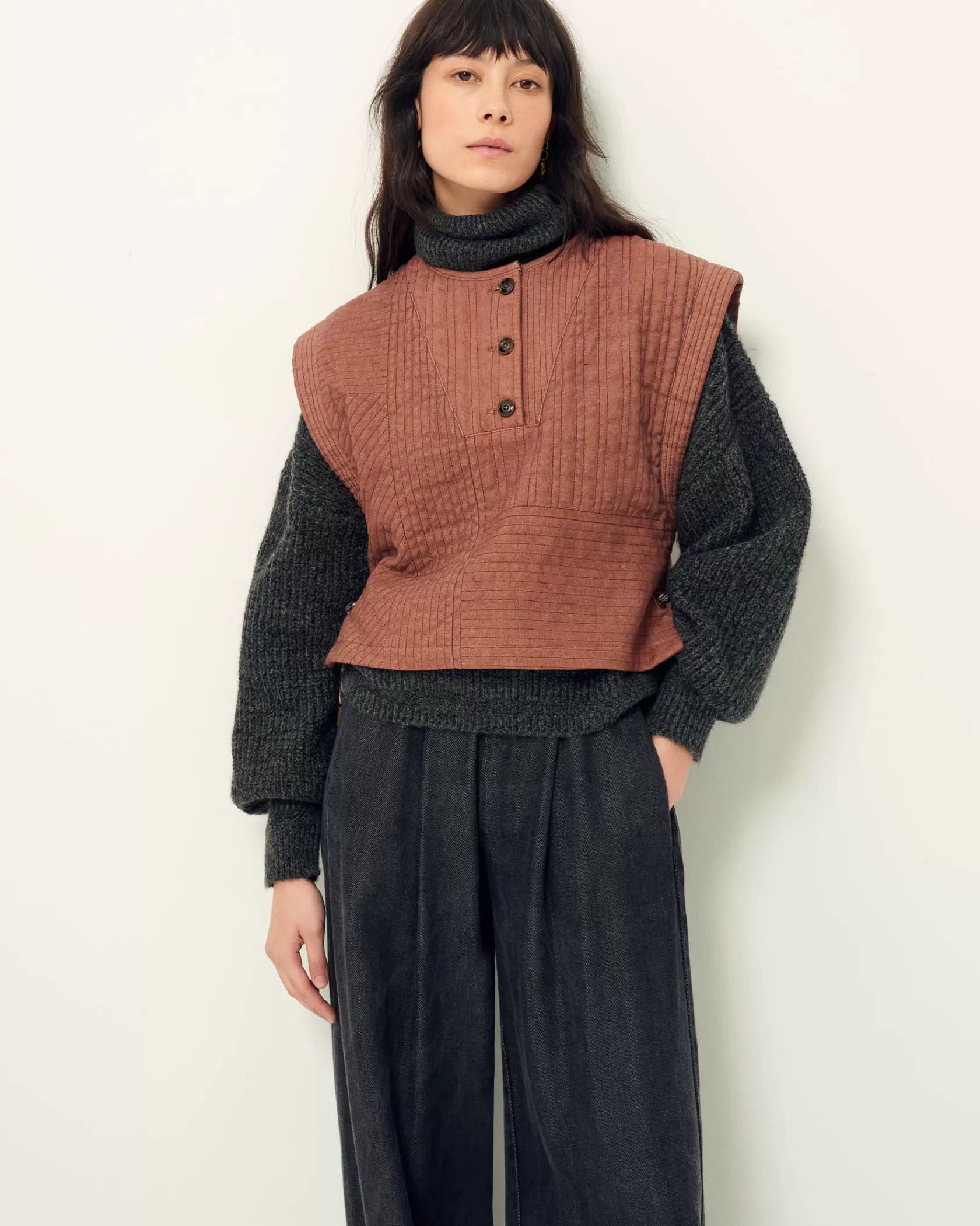 Vareuse sans manches matelassée avec détail de liens sur les côtés en denim stonewashé et surteint, surpiqué fantaisie et matelassé esprit patchwork de boutis, motifs exclusif Sessùn.