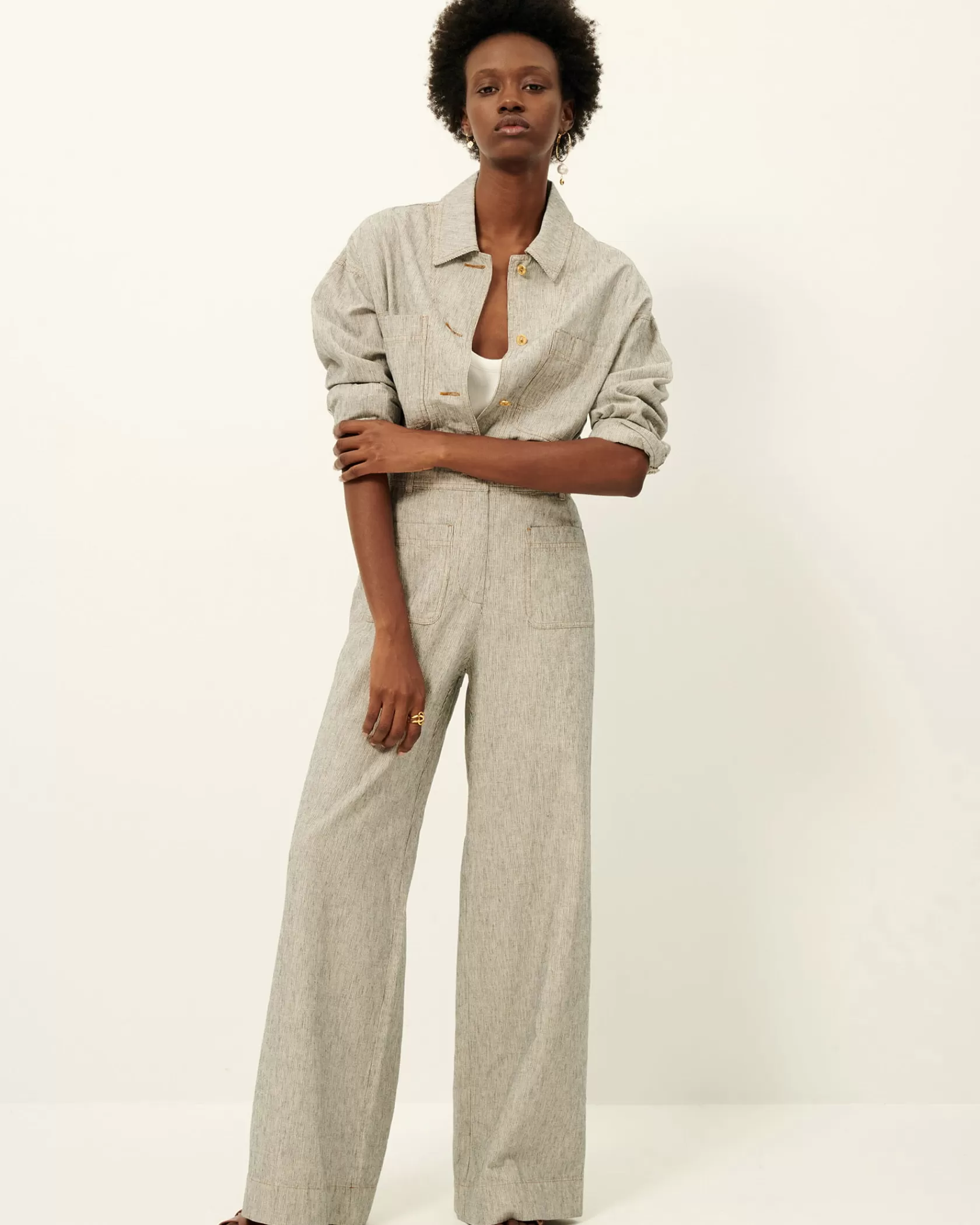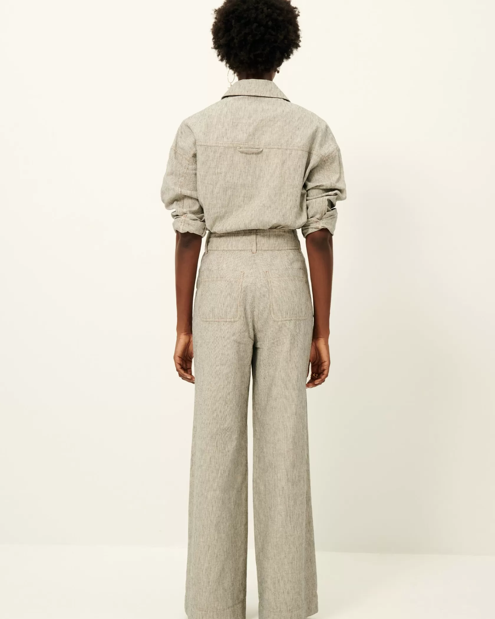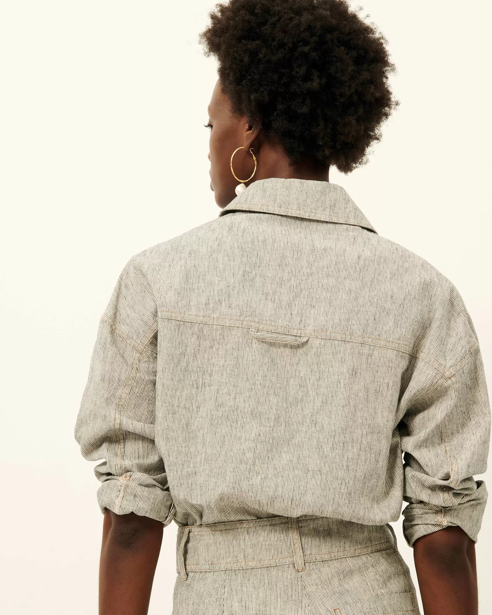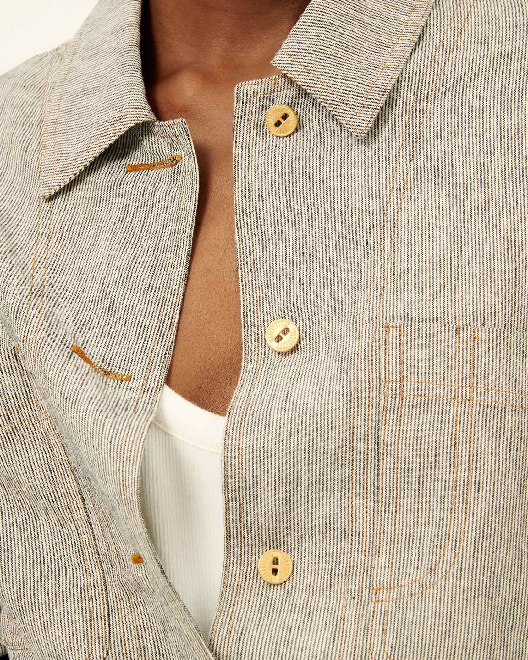 Surchemise à poches plaquées en toile armurée lin coton rayée bicolore de fil flammé tissée en Espagne.