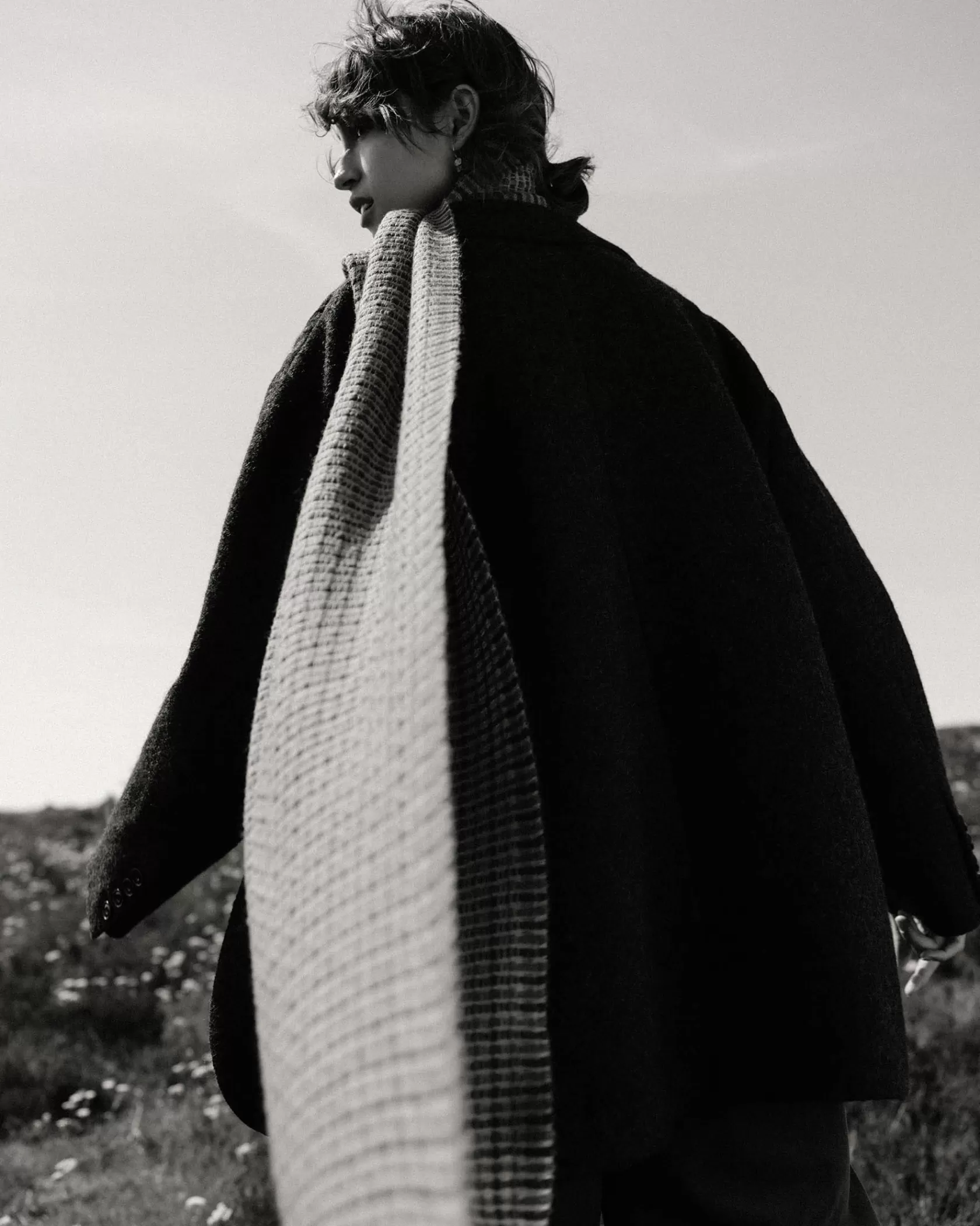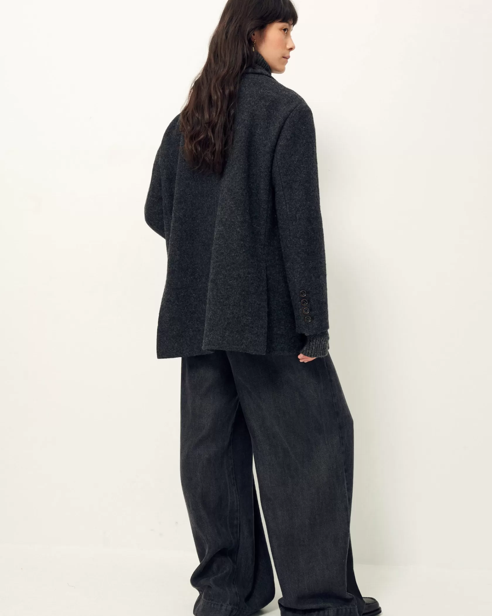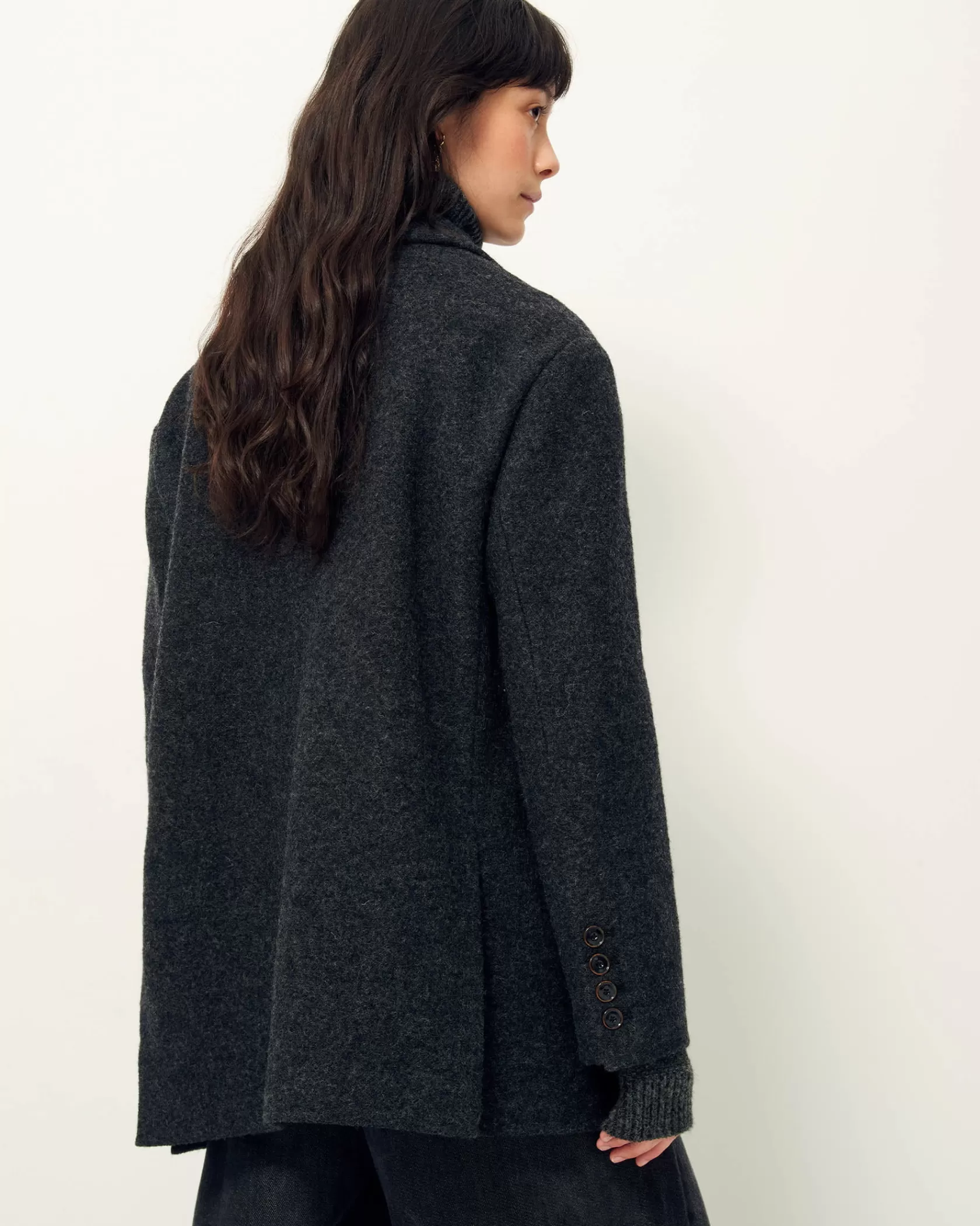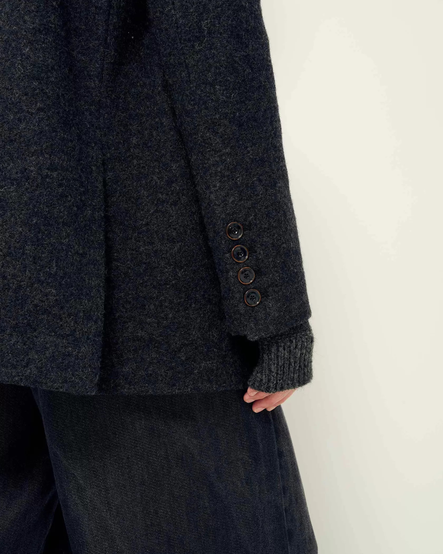 Veste de costume oversize en lainage loden (laine bouillie) chiné, en armure toile.